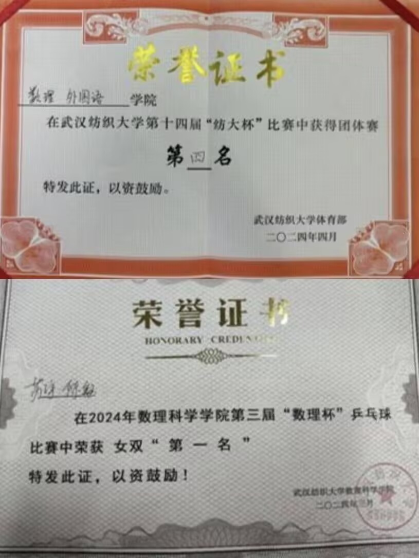 应数12301班学生,现任应数12301班学习委员,曾任院体育部部长、院乒乓球副队长。曾获2023-2024学年一等学业奖学金,主持2024年大学生创新创业训练计划省级立项一项。获2023-2024学年三好学生,青年志愿者优秀个人等荣誉称号;在专业竞赛中屡创佳绩,获第十七届“华中杯”大学生数学建模挑战赛一等奖、第十一届全国大学生统计建模大赛二等奖;学习之余,积极进行体育运动,在探花做爱
