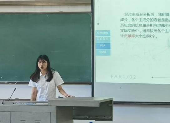 和个人等角度给出了建设性的建议。信科11801班陈婉馨同学报告了几种聚类算法在银行营销数据中的比较研究,分别介绍K-Means聚类算法、层次聚类算法、主成分分析法、t-SNE四种算法,通过不同算法的对比得到了不同情况下的最优算法。信科11801班黄斌同学开展了湖北省第三产业影响因素的分析,从第三产业的发展现状、发展优势与劣势等方面向大家介绍了课题的主要研究内容。应数11801班陈安龙同学的研究课题是基于PK-means++聚类和加权的k近邻算法研究,通过现有k近邻算法的不足,从算法角度和数据角度提出了改进的想法,并用实验分析对其结果进行了比较。
