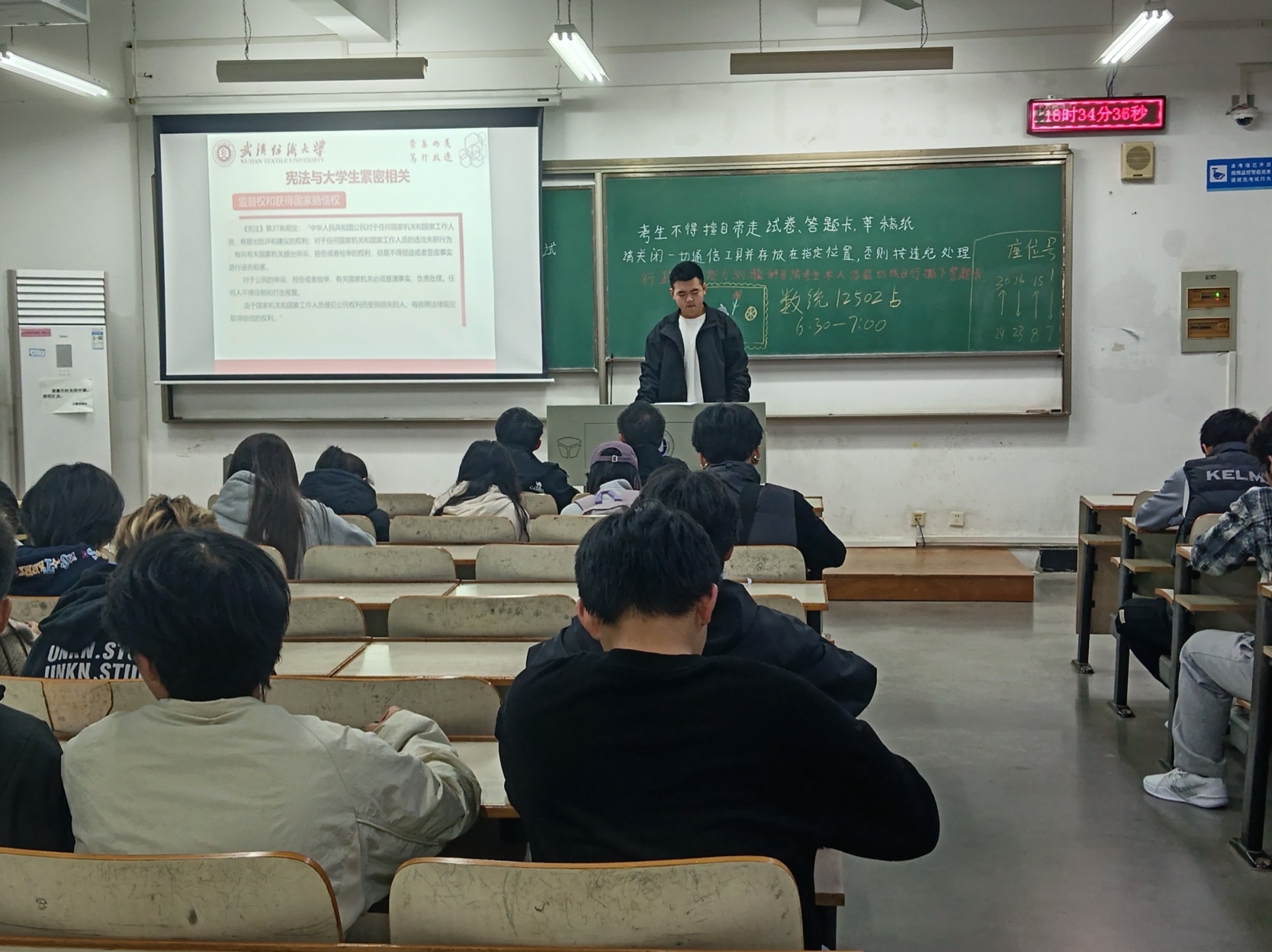 随后,班会重点讲解宪法基本知识。主持人详细介绍了宪法的定义、地位、基本原则与核心精神,明确现行宪法是 1982 年通过并历经五次修改的第四部宪法,其内容涵盖国家基本制度、公民基本权利与义务、国家机构等重要方面。通过案例解读,同学们了解到宪法与日常生活的紧密联系 —— 从出生时的权利保障、上学时的受教育权,到成年后的选举权、工作后的劳动权与休息权,再到婚姻家庭保护、退休后的生活保障,宪法的守护贯穿人生全程。针对大学生群体,主持人特别强调了平等权、宗教信仰自由、人身自由、监督权等宪法赋予的基本权利以及维护国家统一、遵守宪法法律、保卫祖国等公民应尽的基本义务。