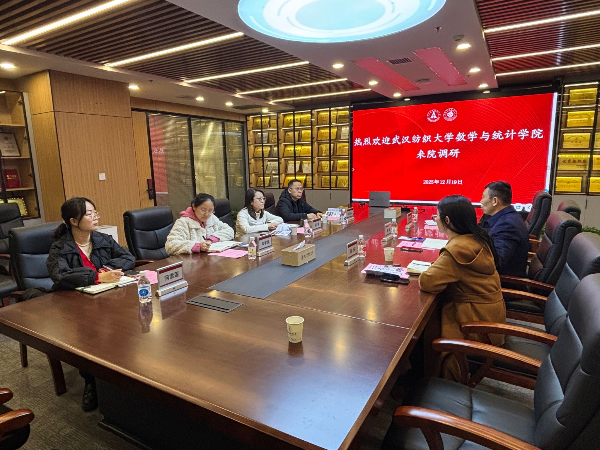 党委书记李楠、副院长郑仟、办公室主任刘文祥一行,专程赴中南财经政法大学统计与数学学院进行调研学习。中南财经政法大学统计与数学学院党委书记梁娜、副院长吴远山、学院办公室主任向雪莲、党务秘书丰宁瑞对调研团表示热烈欢迎,并全程参与交流活动。