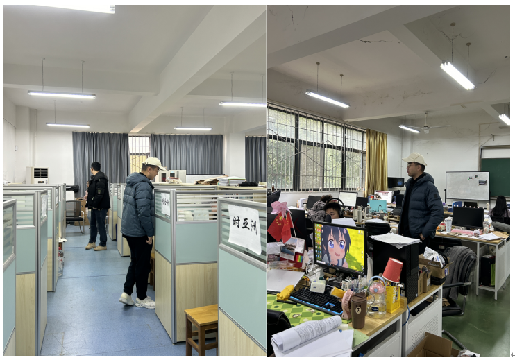 办公室主任刘文祥带领教学秘书刘简、科研秘书熊思健对学院公共区域、各系(中心)办公区域及研究生工作室开展全覆盖安全隐患排查。