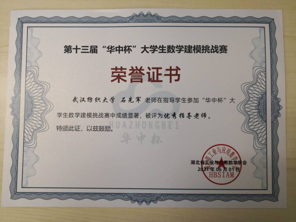 有300多名学生参赛,获得85项省级奖项,现正在积极参加全国决赛;毛耀老师被中国数学学会评为大学数学优秀指导老师。在全国大学生数学建模大赛上,纺大学子斩获4项省赛二等奖1项,三等奖3项),石先军老师被评为优秀指导老师;在美国大学生数学建模大赛,纺大学子斩获二等奖3项、三等奖18项,郑仟老师被评为优秀指导老师。相信不久的将来,越来越多的纺大学子会在数学素养提升中绽放青春芳华,越来越多的教师会收获更大的荣光!