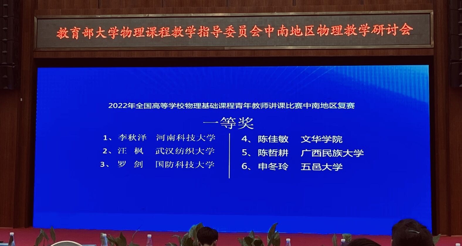 汪枫老师以总分第二名的好成绩获得一等奖,成功晋级全国物理基础课程青年教师讲课比赛决赛,预祝汪枫老师在全国大赛的舞台上继续高歌猛进,取得优异成绩!
