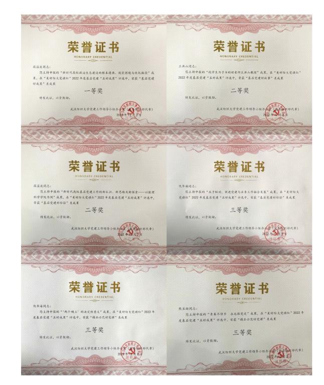 为例》、仇华海老师的《五子联动,促进党建与业务工作融合发展》分别获得“基层党建好经验”二等奖三等奖,仇华海老师的《“两个确立”的决定性意义》、熊亚雄和方媛老师的《青春不停步 永远跟党走》获得“精品示范好党课”三等奖,王洪山老师的《视学生为子女的好老师王洪山教授》获得“基层党建好故事”二等奖。