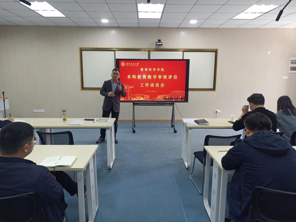 本科教育教学审核评估工作动员会精神。学院全体教职工与会,院长汪胜祥主讲,党委书记段溢波主持。