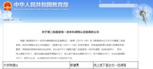 教师郭健勇主持建设的《大学物理AI》课程获批第二批国家级一流课程。