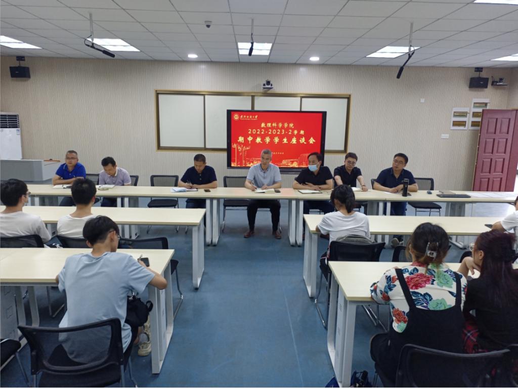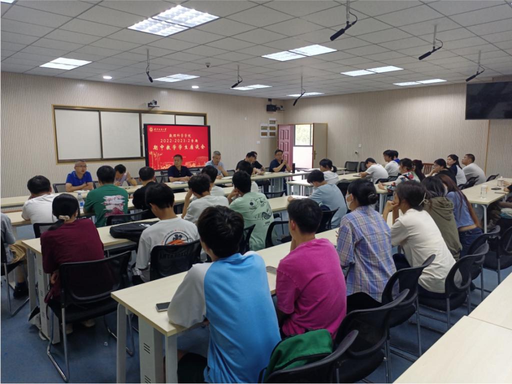 2022-2023学年第二学期期中教学学生座谈会”。学院党委书记段溢波、副院长许明耀、副书记陈国鹏、各系(中心)主任和学院本科生4个年级16个班的32名学生代表参加了座谈会,会议由副院长许明耀主持。