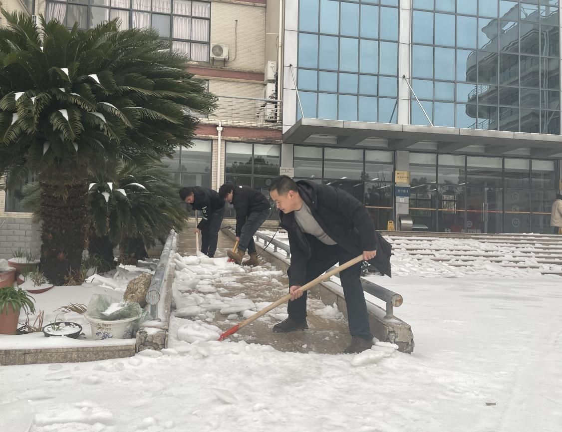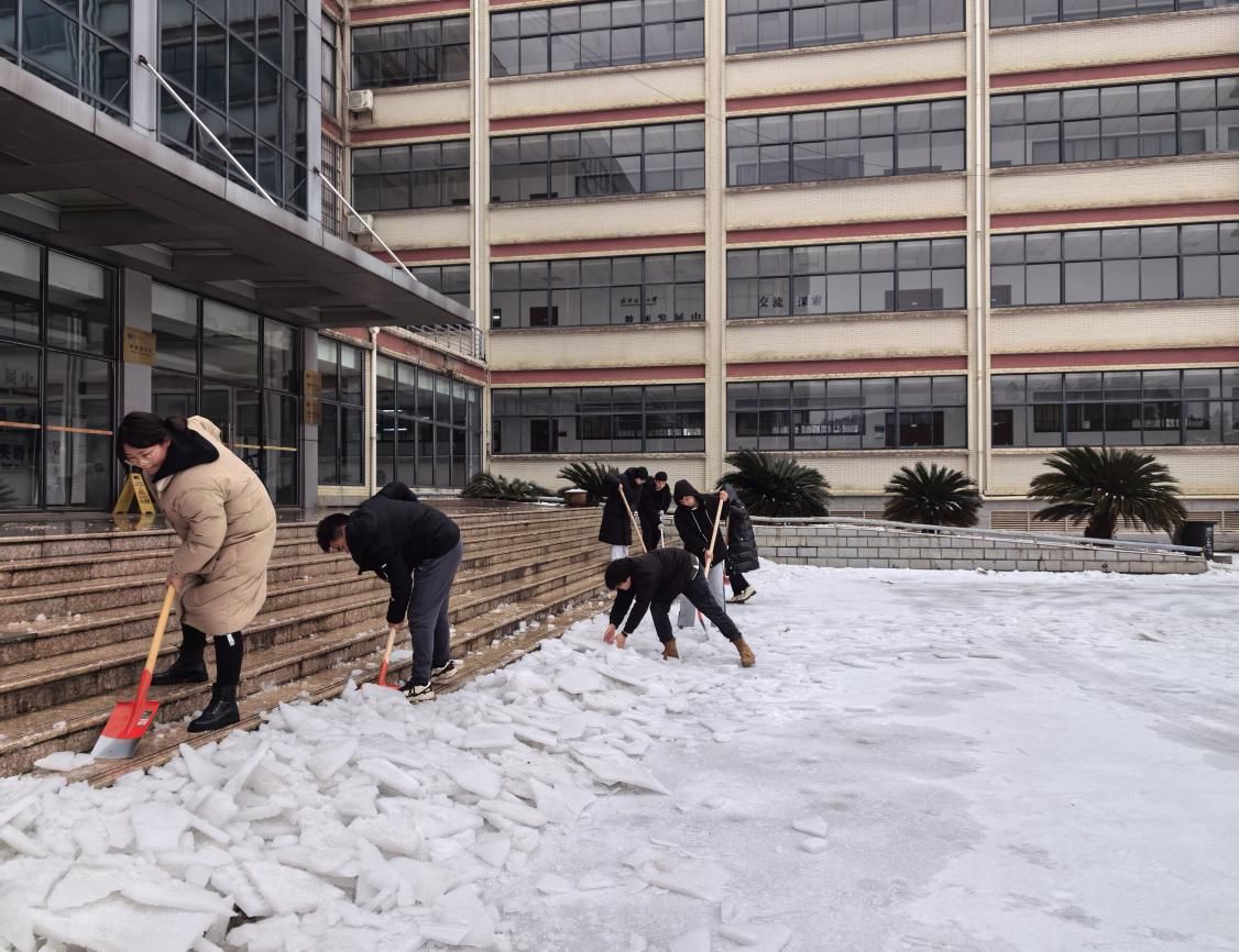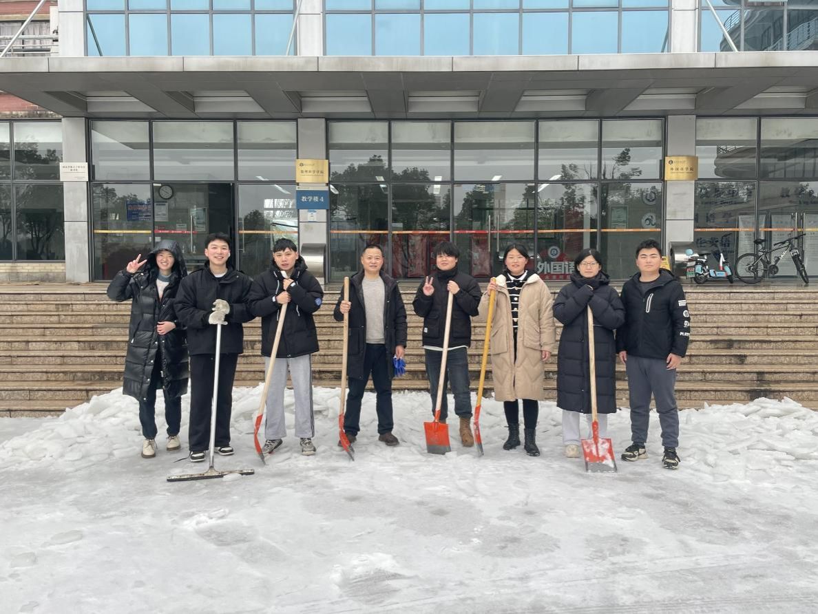 党委副书记陈国鹏带领学院研究生分会、学生党支部组织的志愿队,清理四号教学楼门口积雪坚冰,为新学期开学做好安全保障。