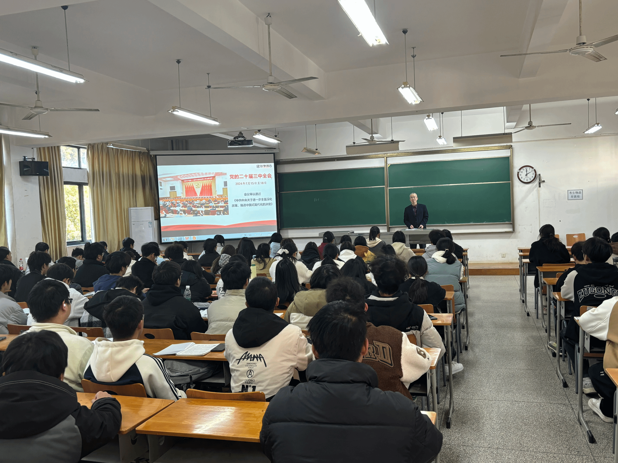 党委书记段溢波以形势政策课宣讲方式,在阳光校区6号教学楼221教室,为学院24级新生开展了党的二十届三中全会精神专题宣讲。