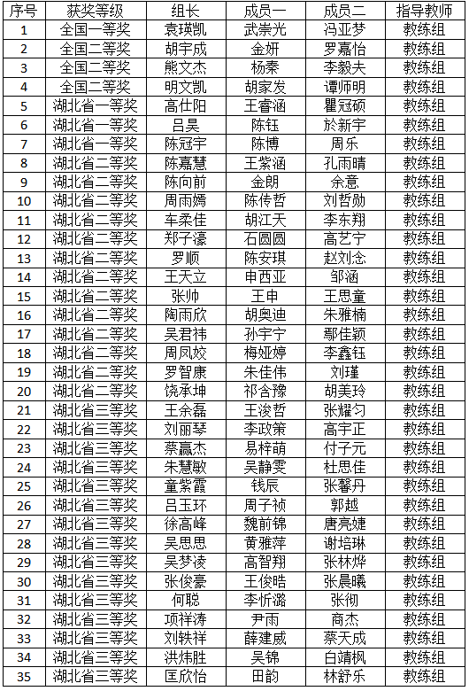 共斩获国家级奖项4项,湖北省奖项31项。其中,全国一等奖1项,全国二等奖3项,湖北省一等奖3项,省二等奖13项,省三等奖15项。获奖质量、数量及获奖率均为探花做爱