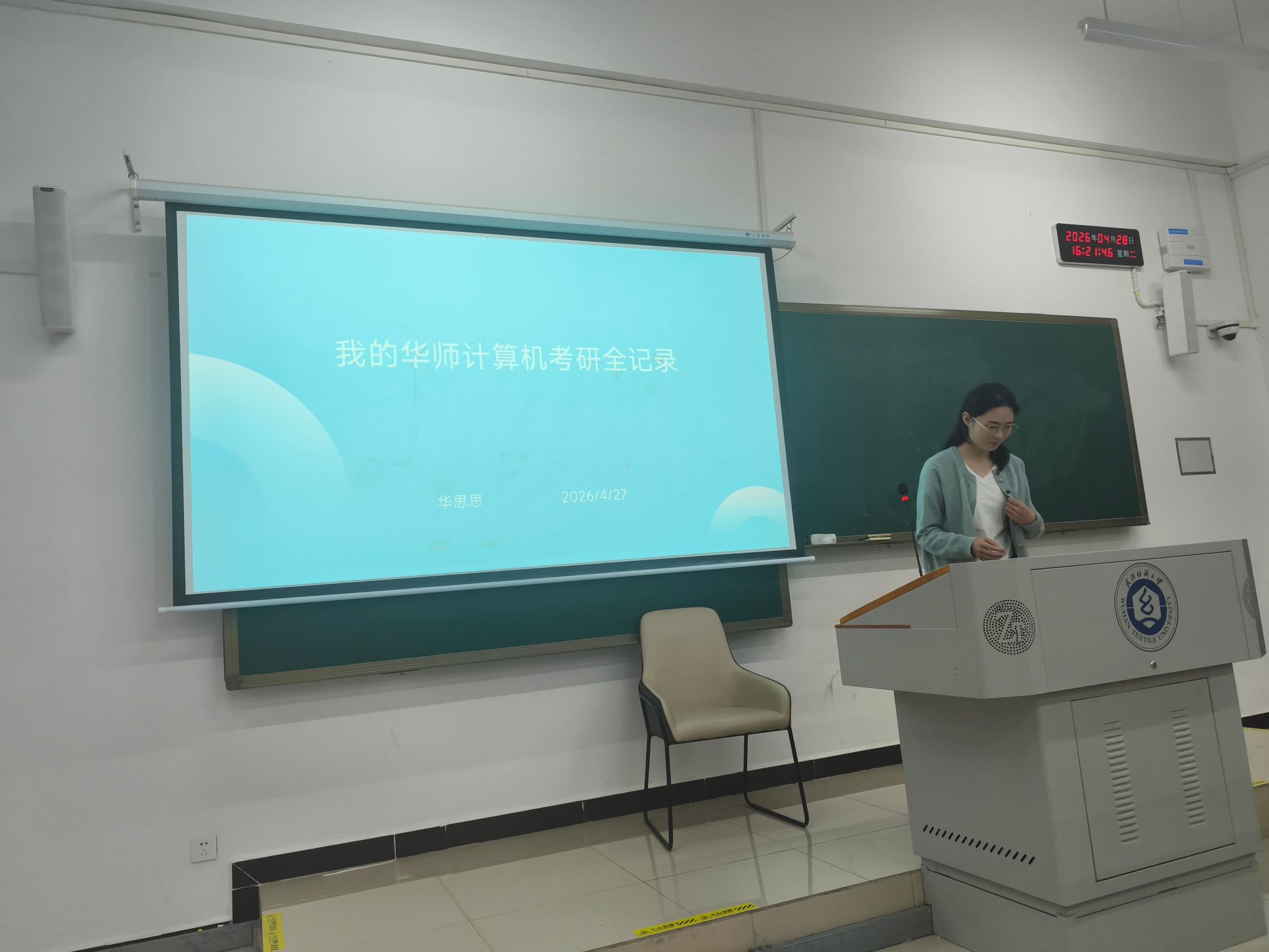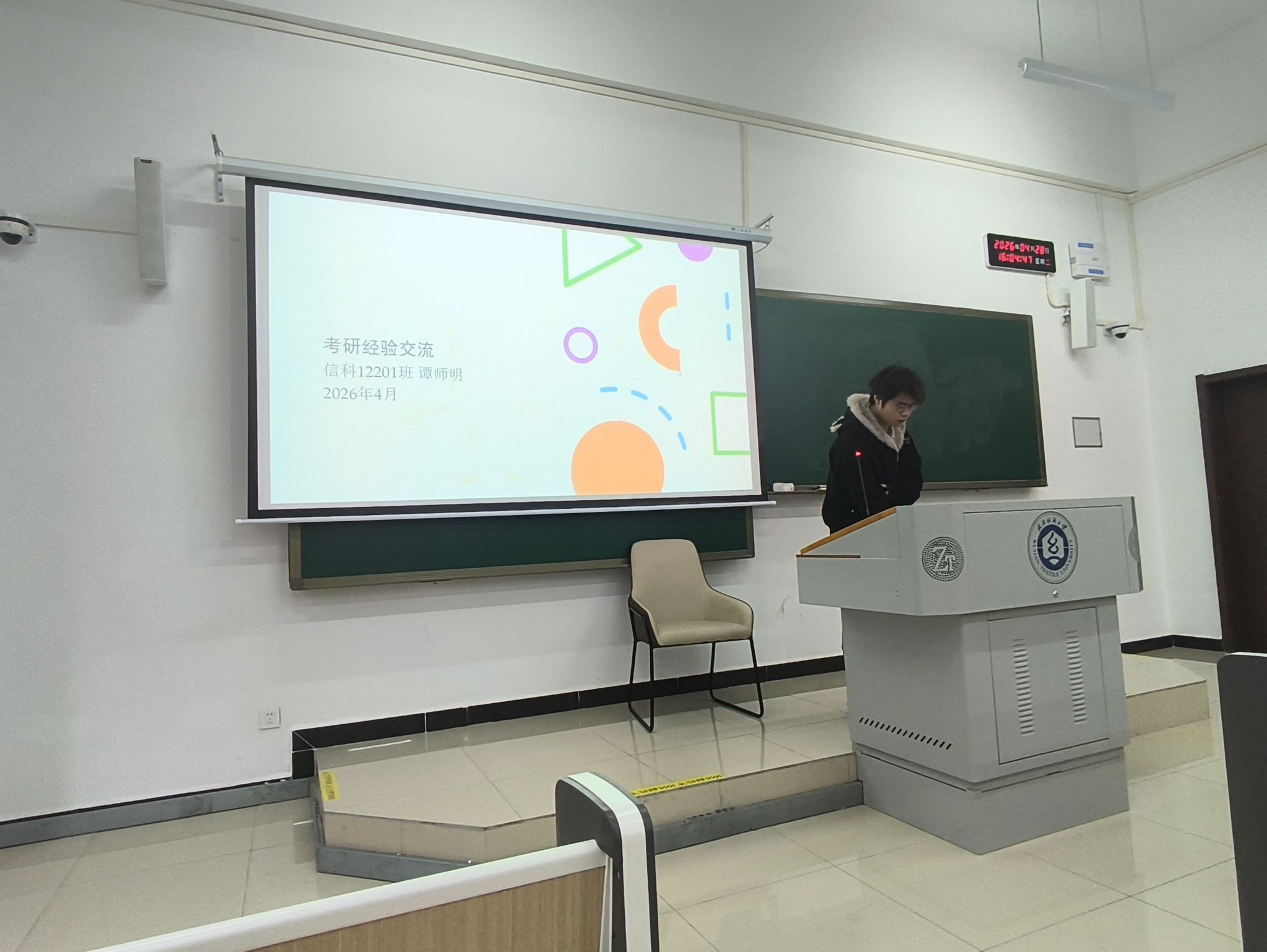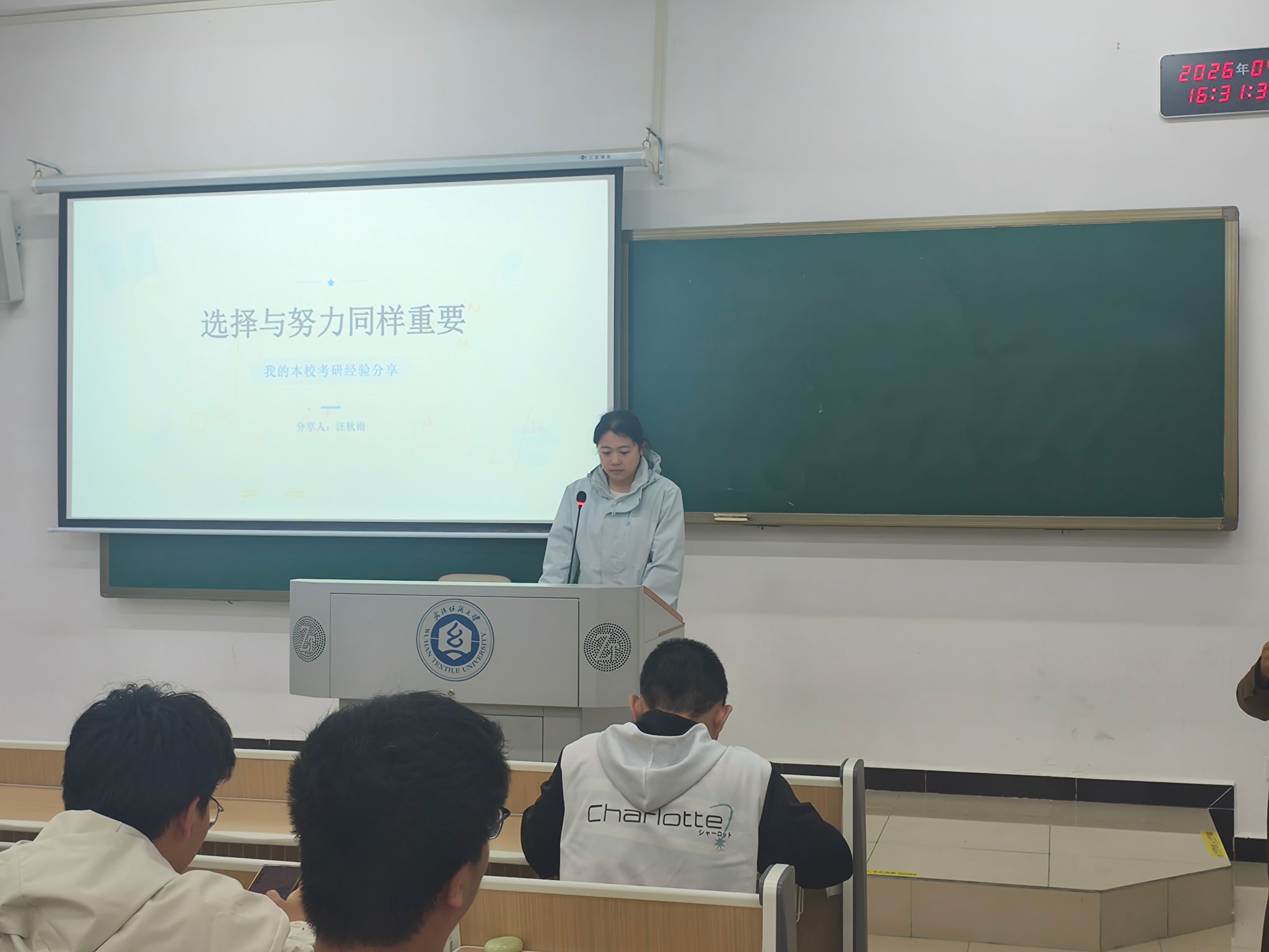 最后,信科12201班的汪秋雨同学以《选择与努力同样重要》为题,从自身实际出发,结合本校考研的命题特点与培养方向,为同学们梳理了本校考研的优势与备考重点。她从专业课复习的核心方向、导师联系的时机与方法,到如何利用本校资源提升备考效率、如何应对复试环节的考核重点,进行了细致讲解,为选择本校考研的同学提供了清晰的备考思路,提升备考的信心与成功率。