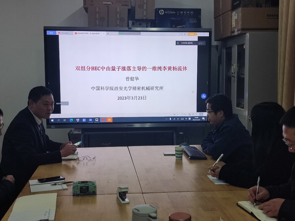 邀请中科院西安光机所的曾健华研究员作题为“双组分BEC中由量子涨落主导的一维纯李黄杨流体”的学术报告。此次论坛由学院物理学科带头人周勤教授主持,学院相关方向的老师、研究生和本科生参加,会议在4-103举行。