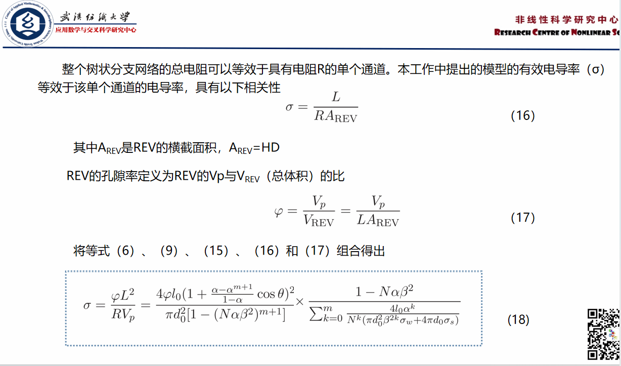 王瑞瑞:本次汇报的主要内容推导了一个基于饱和水树状分支网络的分形电导率模型。新模型同时考虑了σw和σs,并分析了饱和水树状分支网络中电流阻塞的原因。详细讨论了树状分支网络结构参数对总电导率的影响。我们发现,母通道的β和d0的增加对REV的总电阻有负面影响,而对总电导率有积极影响。所提出的模型与实验数据的比较表明,孔隙率的增加会导致电导率的增加。此外,通过研究内部参数(Dd,Dl,N,m,ξ,θ)对形成因子(F)的影响,进一步揭示了树状分支网络中电阻的变化趋势。本文建立的树状分支网络模型是在许多简化的基础上建立的。因此,我们将在未来的研究中建立更现实的电导率模型。
