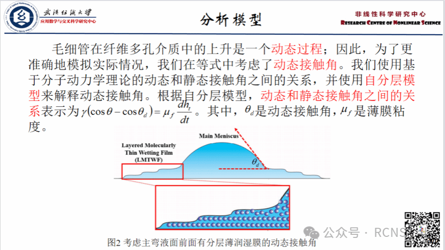 胡佳青:本次组会汇报了液体通过纤维多孔介质的动力学:实验、分析和数值研究。在本研究中,开发了一个稳健的分析和数值模型来预测液体通过纸基板流动。并且综合了多种效应,如纤维的膨胀和粗糙度的影响,液体的蒸发和动态的接触角。所建立的模型对于预测液体通过纸基板的流动具有较强的通用性和现实性。为验证模型的正确性,进行了液体在纸基板上的流动实验。数值模型和解析模型与实验结果吻合较好,最大误差为5%。在未来,该模型可以扩展到不同的液体、纸张类型和环境条件。所建立的模型可用于纸基微流控器件的优化设计。